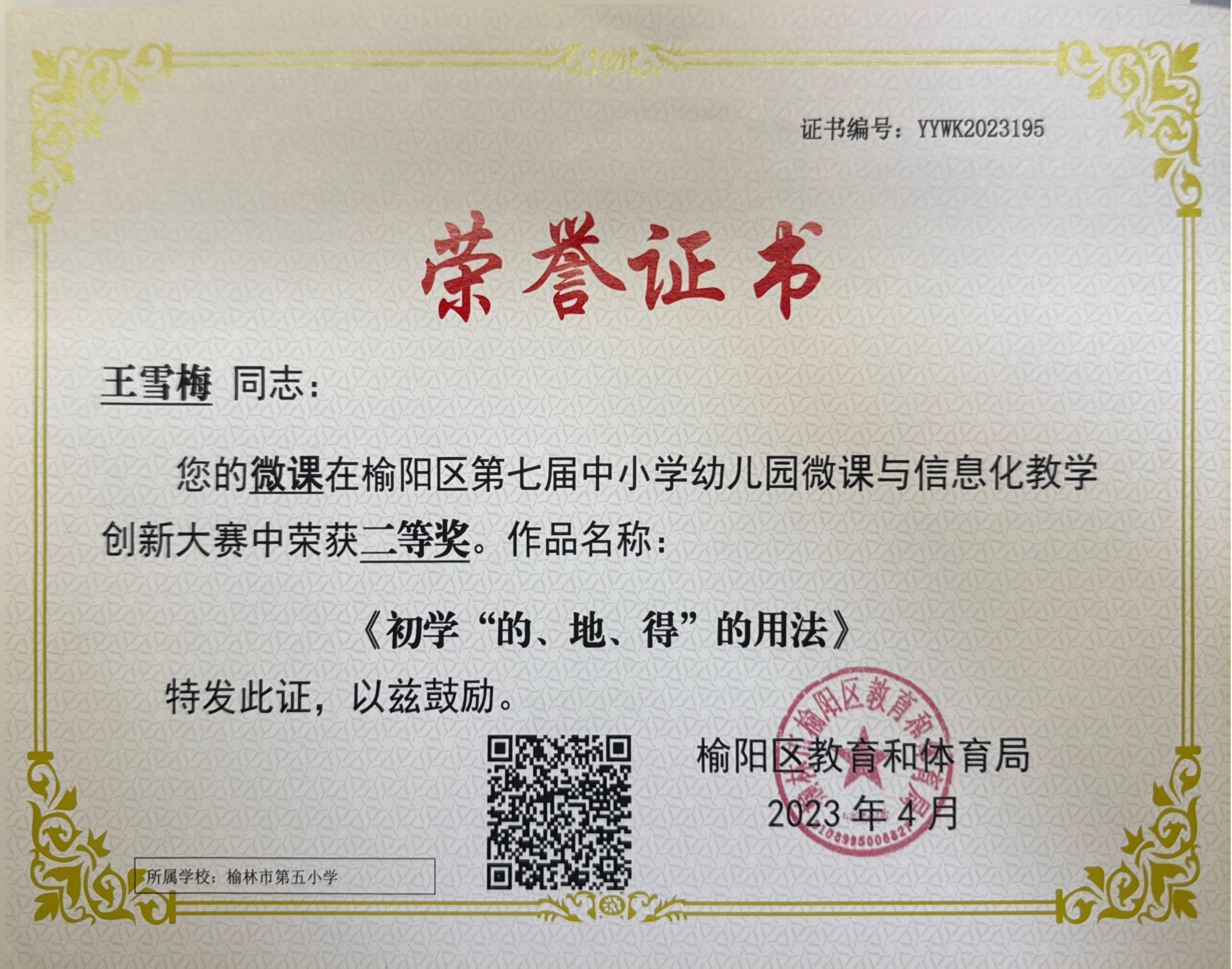 2023年04月19日 荣获 榆阳区第七届中小学幼儿园微课与信息化教学创新大赛 县级教育行政部门 二等