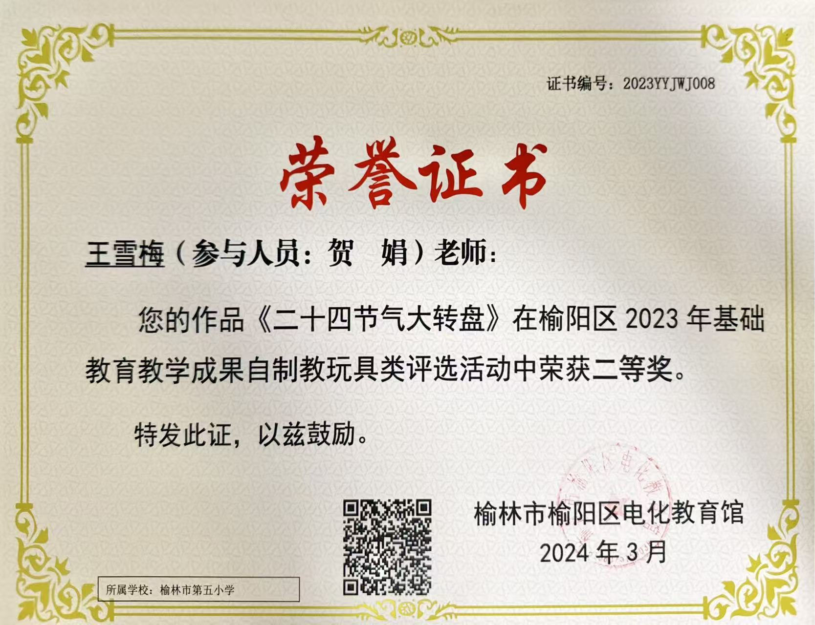 2024年03月19日 荣获 榆阳区2023年基础教育教学成果自制教玩具类评选活动 县级教育行政部门 二等