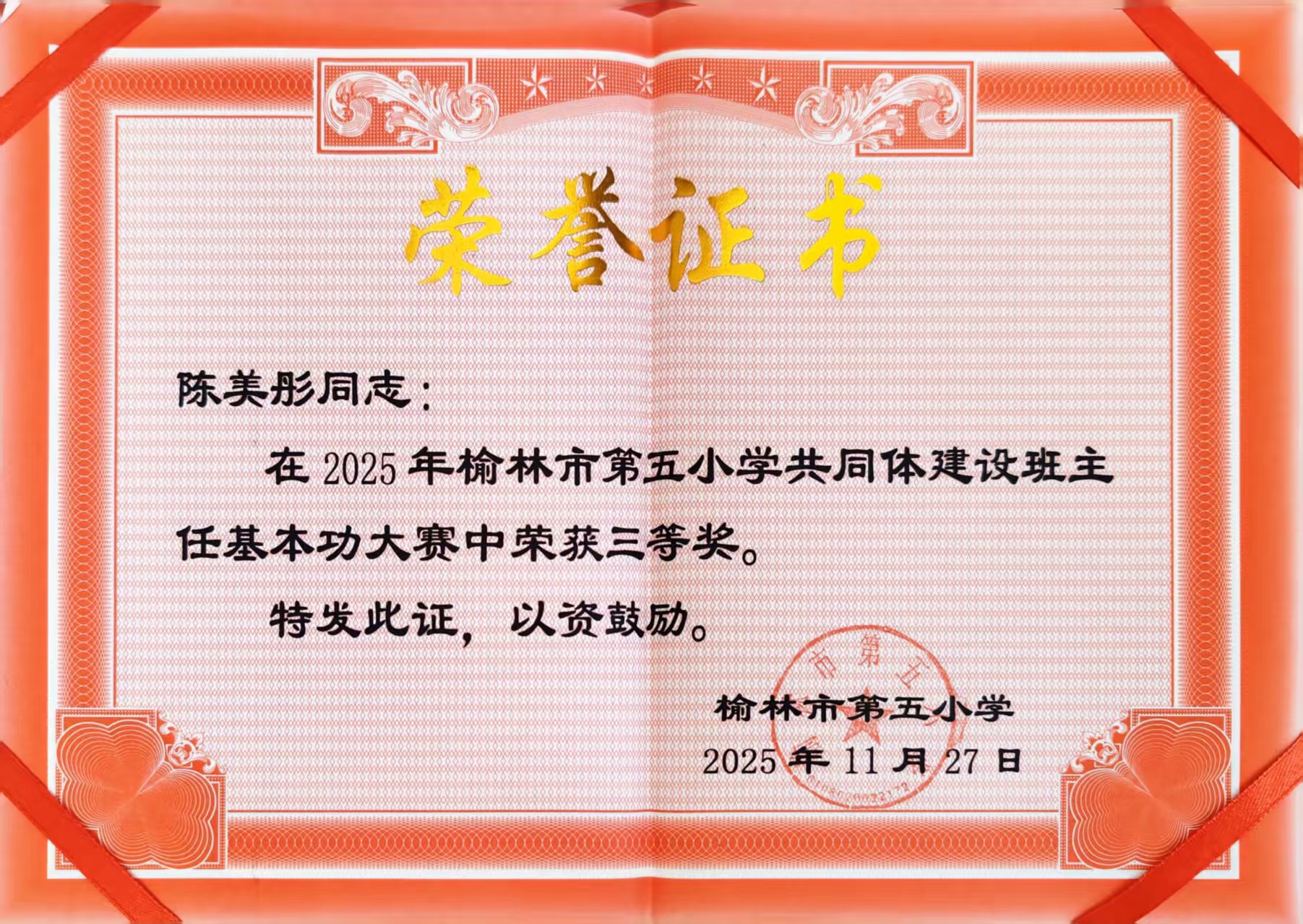 2025年11月27日 荣获 2025班主任技能大赛 学校级 三等