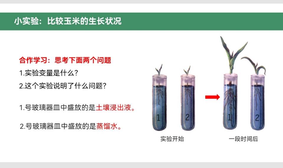 新版上册-第三章>第二节>3.2.2比较玉米幼苗在蒸馏水和土壤浸出液中的生长情况