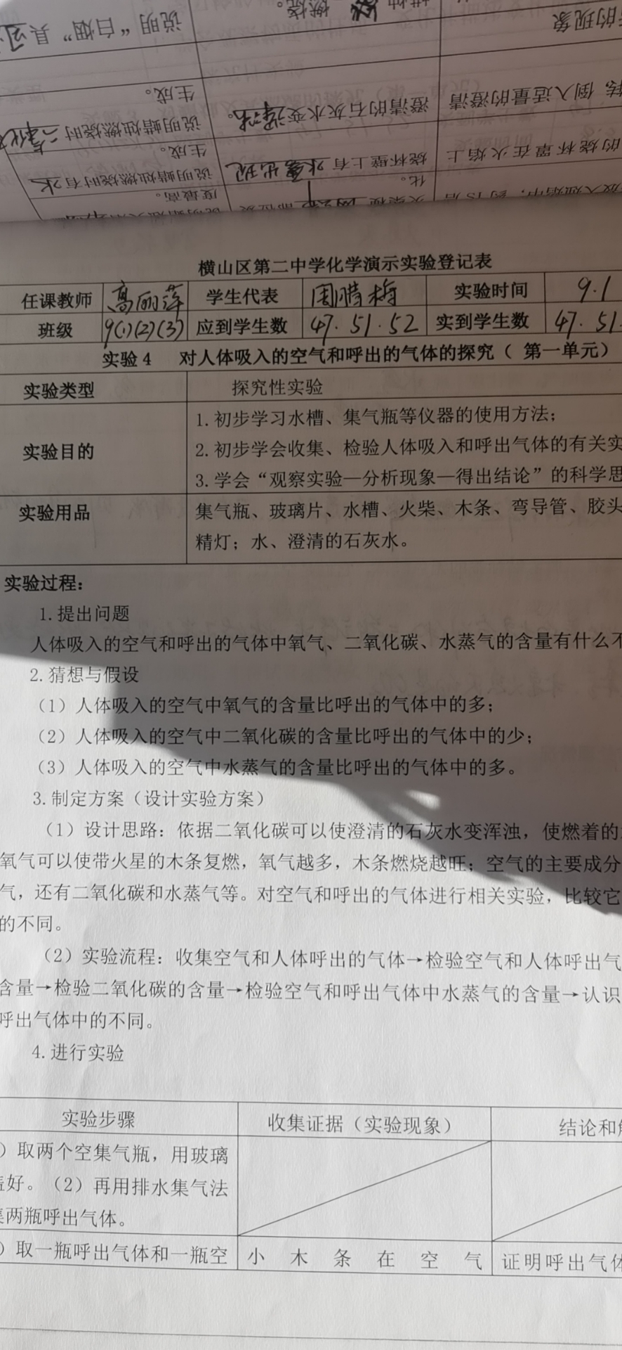 对人体吸入的空气和呼出气体的探究