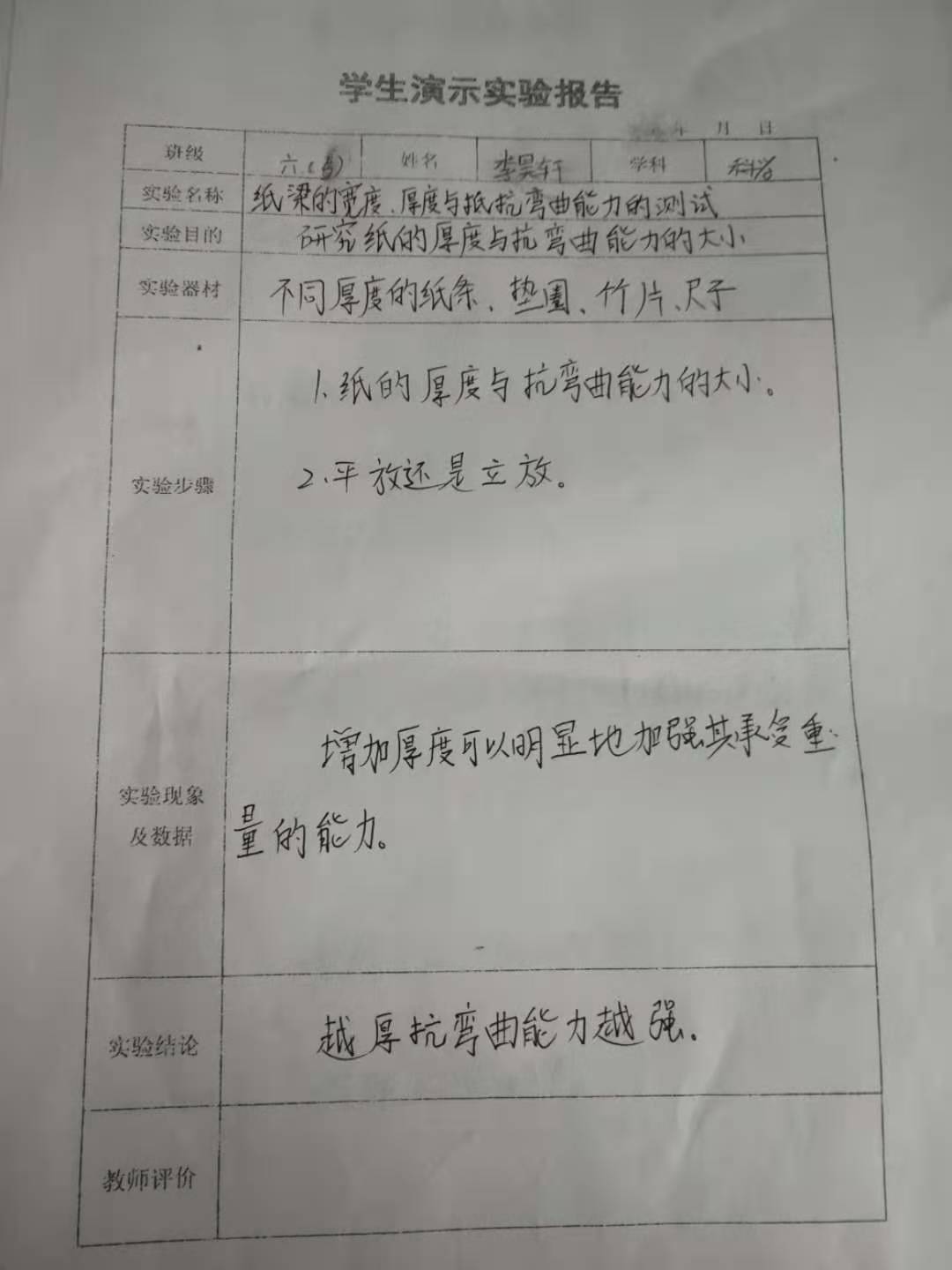 纸梁的宽度、厚度与抵抗弯曲能力的测试